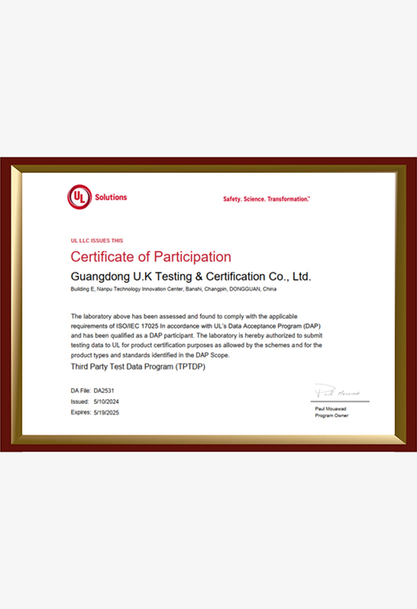 廣東優科檢測認證有限公司(簡稱:UKK)成?于2007年,是國內專業的汽車整車及零部件、電子元器件第三方檢測實驗室,國家級中小企業公共(技術)服務示范平臺,獲得了國家?新技術企業、廣東省專精特新中小企業、市級工程技術研發中心等榮譽稱號。 More